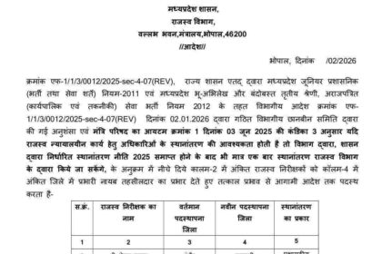 MP (संवाद)। मध्यप्रदेश में राजस्व विभाग में प्रदेश के तमाम जिलों में पदस्थ राजस्व निरीक्षकों की पदोन्नति की गई।जिसमें 119…