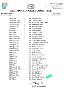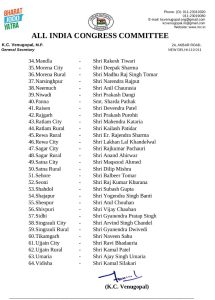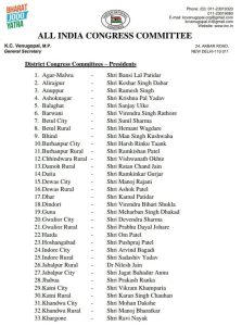 अखिल भारतीय कांग्रेस कमेटी के जनरल सेक्रेटरी संगठन प्रभारी मध्य प्रदेश केसी वेणुगोपाल के द्वारा जारी ऑल इंडिया कांग्रेस कमेटी अकबर रोड नई दिल्ली के लेटर हेड में मध्य प्रदेश में कांग्रेस कमेटी के जिला अध्यक्षों की नई नियुक्ति की गई है।हालांकि कुछ जिलों में इसके पहले भी बदलाव हो चुका था,जिन्हें यथावत रखा गया है। लेकिन कई जिलों में यह बदलाव बहुप्रतीक्षित रहा है। उन जिलों में अब नए अध्यक्षों की नियुक्ति की गई है।