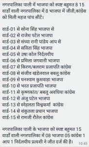 उमरिया/ पाली (संवाद)। जिले के पाली नगर पालिका के चुनाव के नतीजे सामने आ चुके हैं जिसमें भाजपा 8 सीट पर विजय रही है वही कांग्रेस 5 सीटों में तो निर्दलीय के खाते में एक सीट और आम आदमी पार्टी के खाते में 1 सीट गई है।