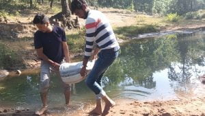बोरी बंधान कर जल संरक्षण का संदेश दे रहे युवा टीम के सदस्य
