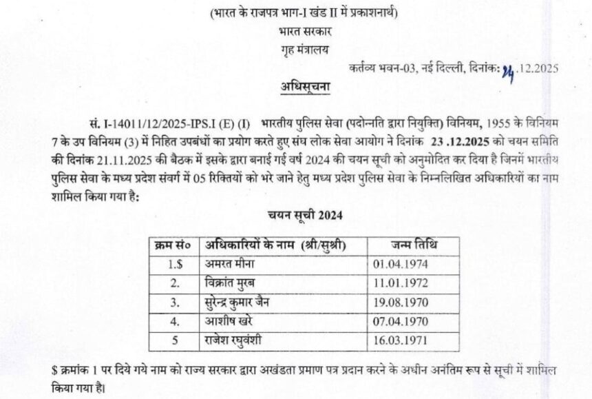 गृह मंत्रालय भारत सरकार द्वारा जारी आदेश में मध्य प्रदेश राज्य पुलिस सेवा के अधिकारियों में अमरत मीना, विक्रांत मुरब, सुरेंद्र कुमार जैन, आशीष खरे और राजेश रघुवंशी का नाम शामिल है। इन पांचो राज्य पुलिस सेवा के अधिकारियों को आईपीएस अवार्ड के लिए अधिसूचना जारी किया गया है।