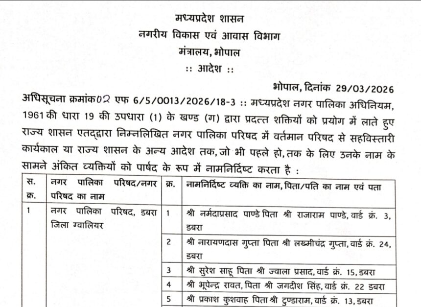 उमरिया। मध्य प्रदेश शासन नगरीय निकाय के द्वारा एल्डर मयंक की नियुक्ति संबंधी आदेश जारी कर दिए गए हैं जिसमें नगर पालिका उमरिया, नगर परिषद नौरोजाबाद, पाली, चंदिया और मानपुर में एल्डरमैंनों की नियुक्ति कर दी गई है।