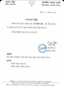 भारतीय जनता पार्टी के राष्ट्रीय महासचिव अरुण सिंह के द्वारा जारी नियुक्ति पत्र में कहा गया है कि भारतीय जनता पार्टी के सांसदी बोर्ड ने बिहार सरकार में मंत्री नितिन नवीन को भारतीय जनता पार्टी का राष्ट्रीय कार्यकारी अध्यक्ष नियुक्त किया गया है यह नियुक्ति तत्काल प्रभाव से लागू हो गई है।