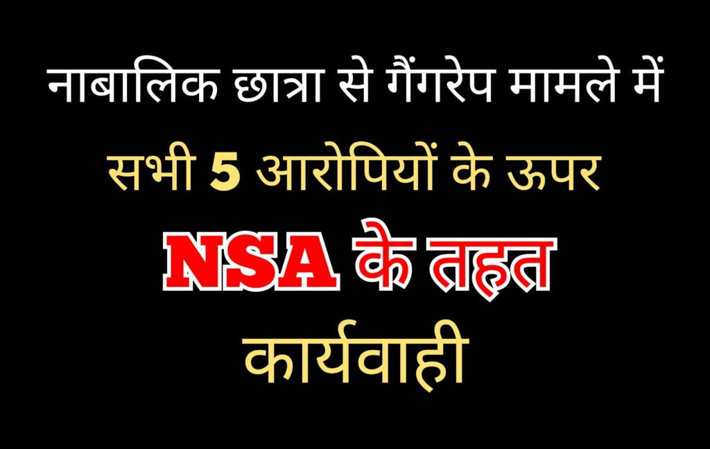 शहडोल (संवाद)। बीते दिनों शहडोल जिला मुख्यालय के कल्याणपुर के जंगल में एक नाबालिक छात्रा के साथ हुए सामूहिक दुष्कर्म मामले में जिला प्रशासन ने बड़ी कार्यवाही की है। जिसमें वारदात को अंजाम देने वाले पांच गैंगरेप के आरोपियों के खिलाफ (एनएसए) राष्ट्रीय सुरक्षा कानून के तहत कार्यवाही की गई है। इसके पहले इन पांचो … Continue reading Shahdol: नाबालिक छात्रा से गैंगरेप के पांच आरोपियों के खिलाफ NSA के तहत कार्यवाही,जिला दंडाधिकारी ने जारी किये आदेश